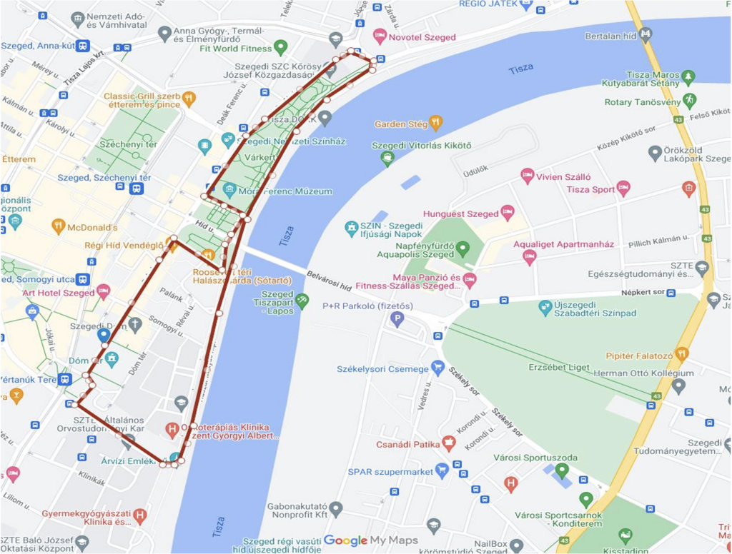 A rajt és a cél a Dóm téren kerül kialakításra. Az útvonal a Dóm térről indul, a Gál Ferenc Egyetem előtt lévő rajtkaputól a Beloiannisz kapun keresztül az Aradi vértanúk terén át, majd balra fordulva a Tisza Lajos Körúton tovább haladva. Az útvonal az Árvízi emlékműnél balra fordul és végighalad a Huszár Mátyás rakparton. A Huszár Mátyás rakpartról balra fordulva a Tisza Lajos körúton félpályás útlezárás biztosítja a tovább haladást a Stefánia irányába. A Stefánia mentén végig haladva a Szegedi Nemzeti Színháznál lévő körforgalomnál rendőrök, illetve kordonok biztosítják a forgalmat. A Belvárosi híd irányába haladva a Stefániánál folytatódik tovább az útvonal, ahol lezárt útszakaszon tudnak tovább haladni, majd a Belvárosi híd előtt balra fordulva a Múzeum előtt elhaladva a Roosevelt tér felé. A Roosevelt teret elérve jobbra halad tovább az útvonal, ahol a Roosevelt téri Halászcsárdát elhagyva balra fordul a Versenyzők részére teljes egészében lezárt Oskola utca irányába, majd visszatér a Dóm térre.