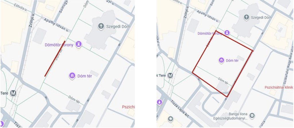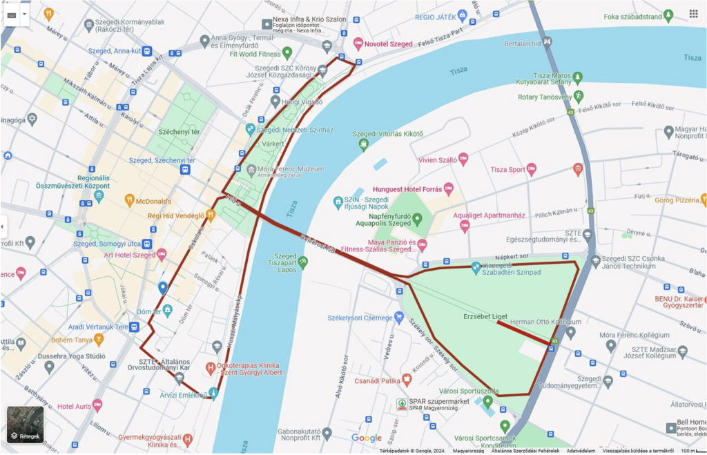 A Dóm téren áthaladva a 6 km-es útvonal következik (3-szor): Az Árvízi emlékműnél balra fordulva a Huszár Mátyás rakparton, majd a Stefánián át a Híd utcára, fel a Belvárosi hídra. Az Erzsébet ligeti rekortán pályán egy kör megtétele után a hídon és a Híd utcán át az Oskola utcán keresztül vezet vissza az út a Dóm térre.